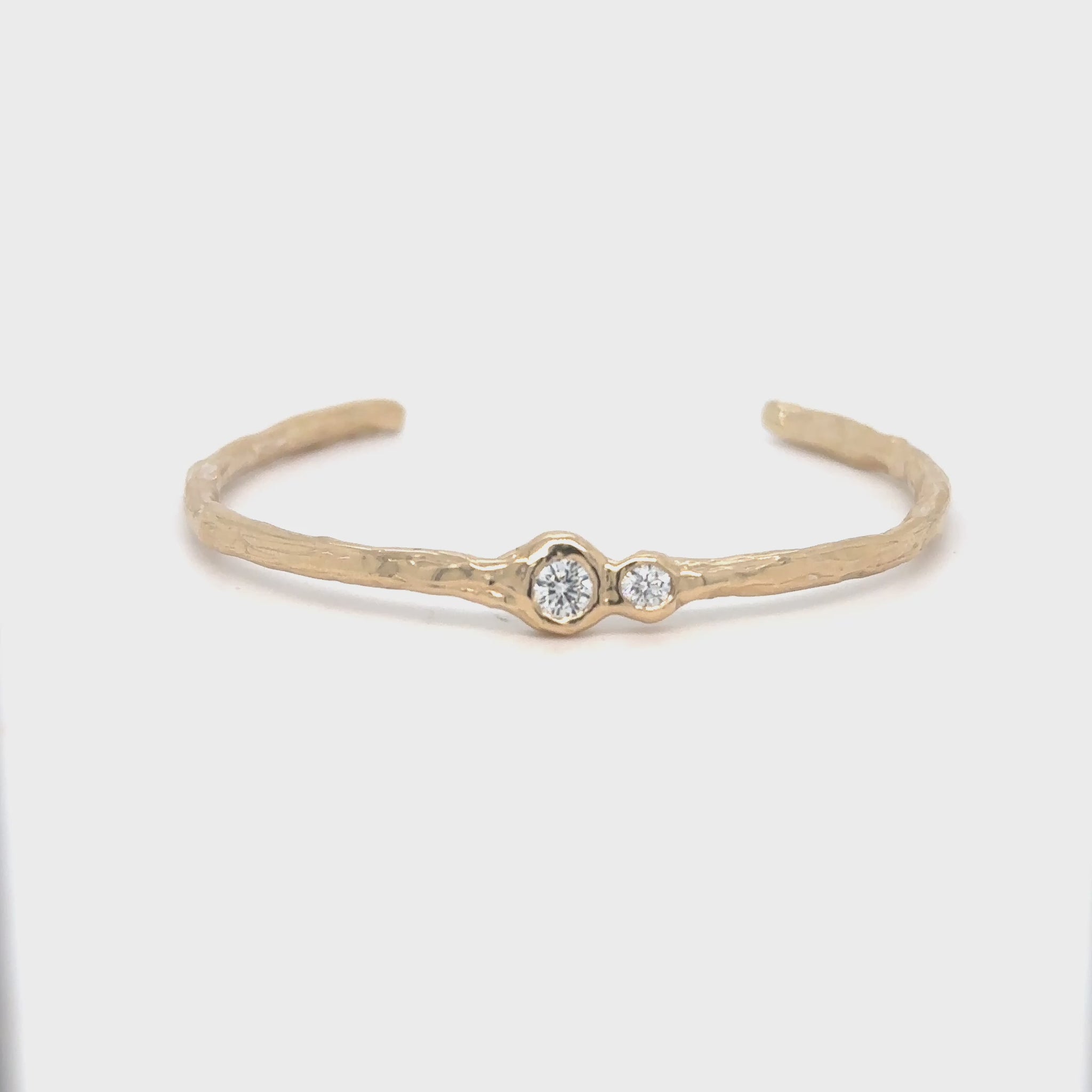 A sculptural 14k yellow gold cuff accented with two bezel-set diamonds. Hand-carved and cast for a natural, fluid form that feels effortless on the wrist.